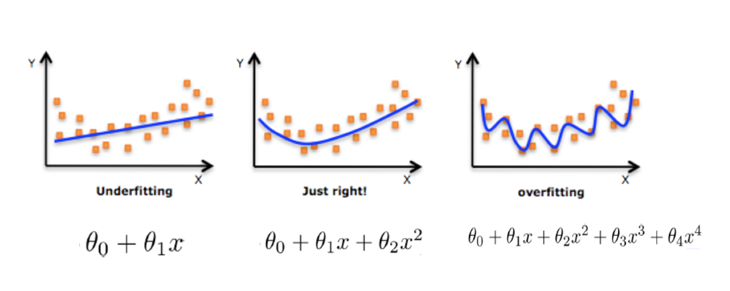 - 欠拟合:一个假设在训练数据上不能获得更好的拟合,并且在测试数据集上也不能很好地拟合数据,此时认为这个假设出现了欠拟合的现象。(模型过于简单)