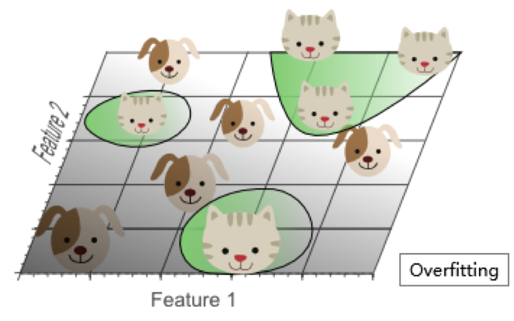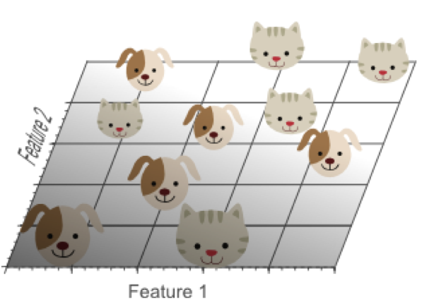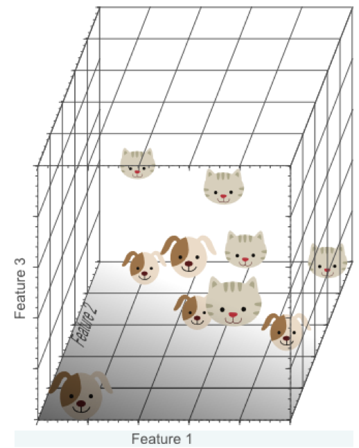 在3维特征空间中,我们很容易找到一个分类平面,能够在训练集上有效的将猫和狗进行分类: