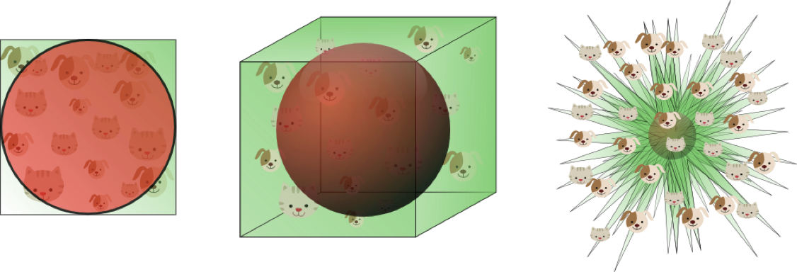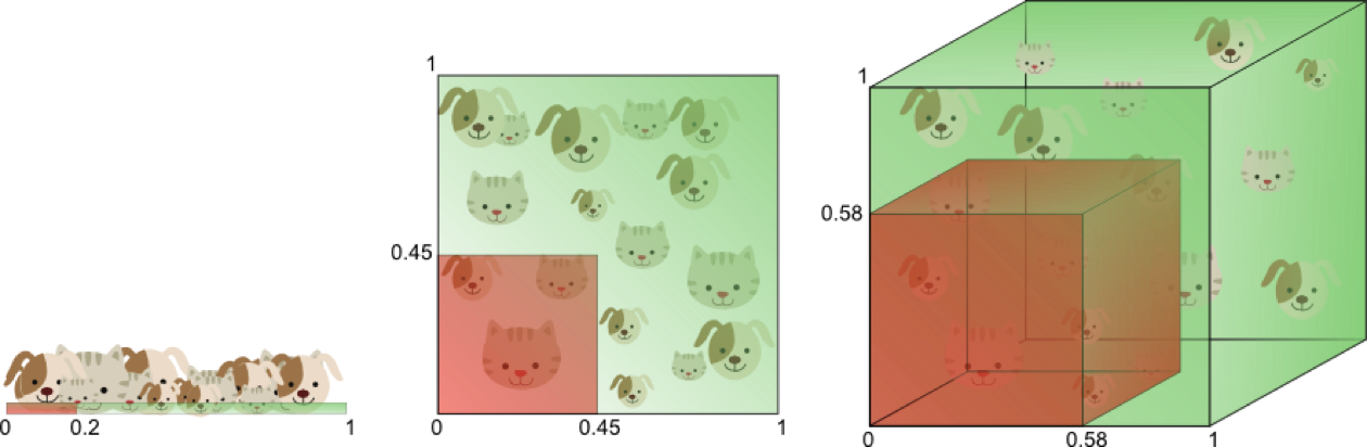 由于高维而带来的数据稀疏性问题:假设有一个特征,它的取值范围D在0到1之间均匀分布,并且对狗和猫来说其值都是唯一的,我们现在利用这个特征来设计分类器。如果我们的训练数据覆盖了取值范围的20%(e.g 0到0.2),那么所使用的训练数据就占总样本量的20%。上升到二维情况下,覆盖二维特征空间20%的面积,则需要在每个维度上取得45%的取值范围。在三维情况下,要覆盖特征空间20%的体积,则需要在每个维度上取得58%的取值范围...在维度接近一定程度时,要取得同样的训练样本数量,则几乎要在每个维度上取得接近100%的取值范围,或者增加总样本数量,但样本数量也总是有限的。