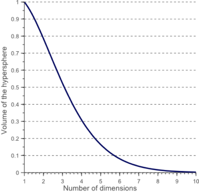 一个有趣的问题是,当我们增加特征空间的维度时,圆(超球面)的体积如何相对于正方形(超立方体)的体积发生变化。尺寸d的单位超立方体的体积总是1 ^ d = 1.尺寸d和半径0.5的内切超球体的体积可以计算为:
