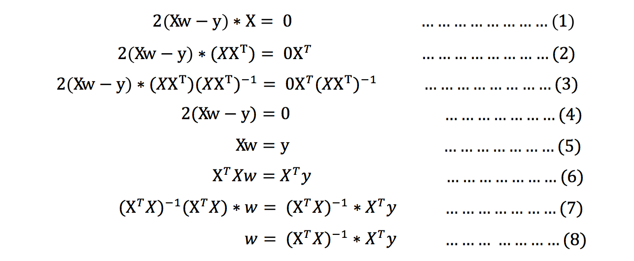 注:式(1)到式(2)推导过程中, X是一个m行n列的矩阵,并不能保证其有逆矩阵,但是右乘XT把其变成一个方阵,保证其有逆矩阵。