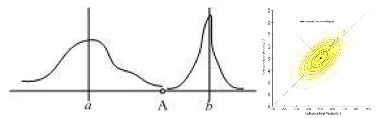 下图有两个正态分布图,它们的均值分别为a和b,但方差不一样,则图中的A点离哪个总体更近?或者说A有更大的概率属于谁?显然,A离左边的更近,A属于左边总体的概率更大,尽管A与a的欧式距离远一些。这就是马氏距离的直观解释。