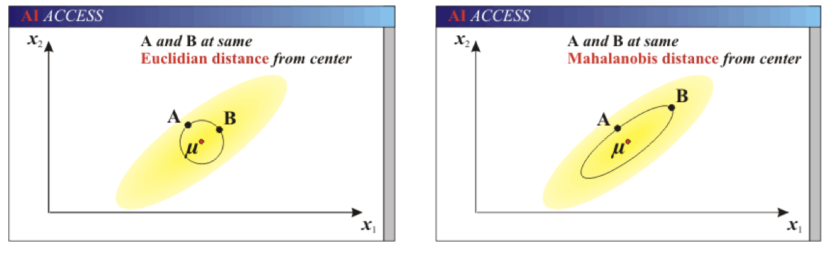 马氏距离也可以定义为两个服从同一分布并且其协方差矩阵为∑的随机变量的差异程度:如果协方差矩阵为单位矩阵,马氏距离就简化为欧式距离;如果协方差矩阵为对角矩阵,则其也可称为正规化的欧式距离。