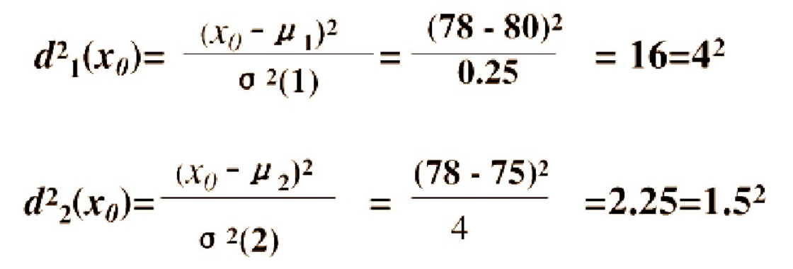 已知有两个类G1和G2,比如G1是设备A生产的产品,G2是设备B生产的同类产品。设备A的产品质量高(如考察指标为耐磨度X),其平均耐磨度μ1=80,反映设备精度的方差σ2(1)=0.25;设备B的产品质量稍差,其平均耐磨损度μ2=75,反映设备精度的方差σ2(2)=4.