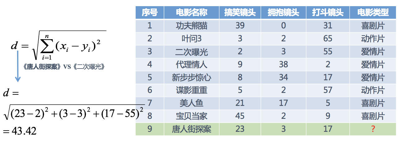 其中? 号电影不知道类别,如何去预测?我们可以利用K近邻算法的思想