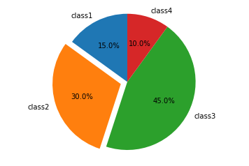 plt.pie(x, labels=labels, autopct='%1.1f%%', explode=[0,0.1,0,0], startangle=90)import matplotlib.pyplot as plt