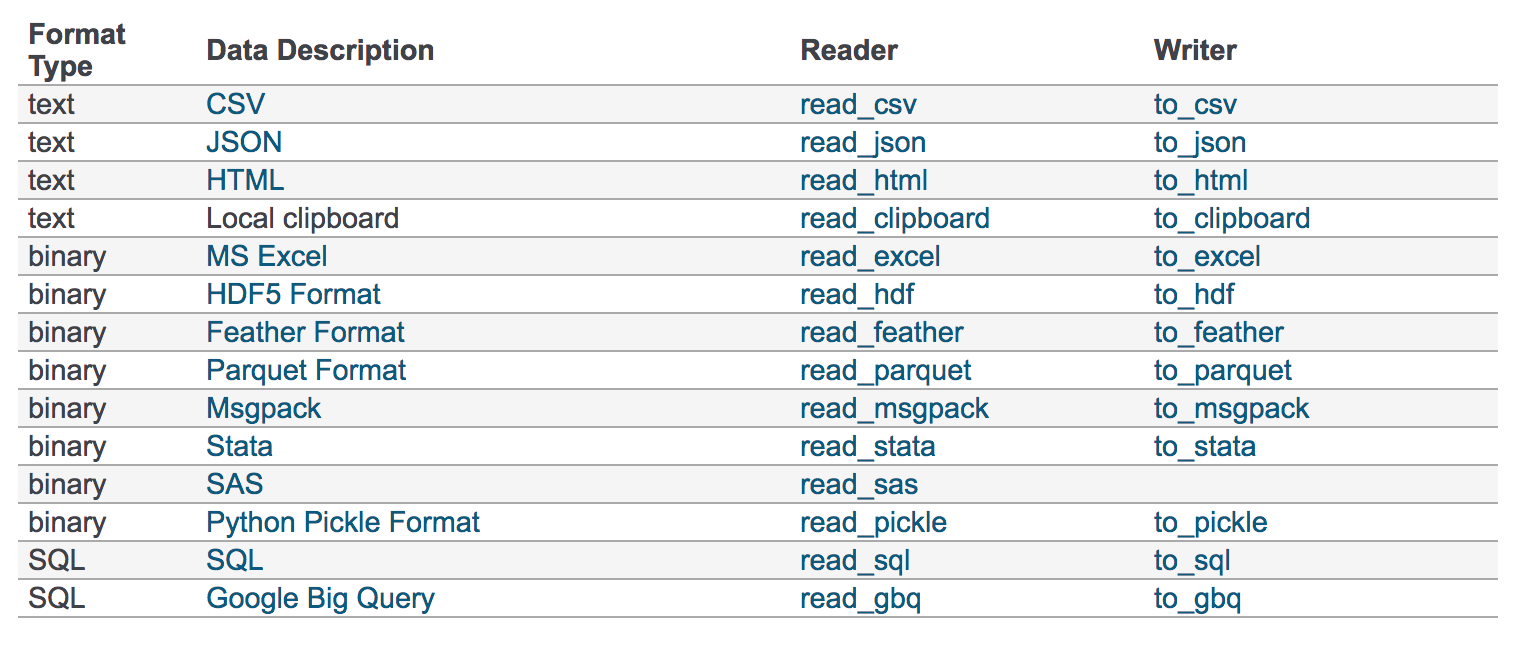 我们的数据大部分存在于文件当中,所以 pandas 会支持复杂的 IO 操作,pandas 的 API 支持众多的文件格式,如 CSV、SQL、XLS、JSON、HDF5。
