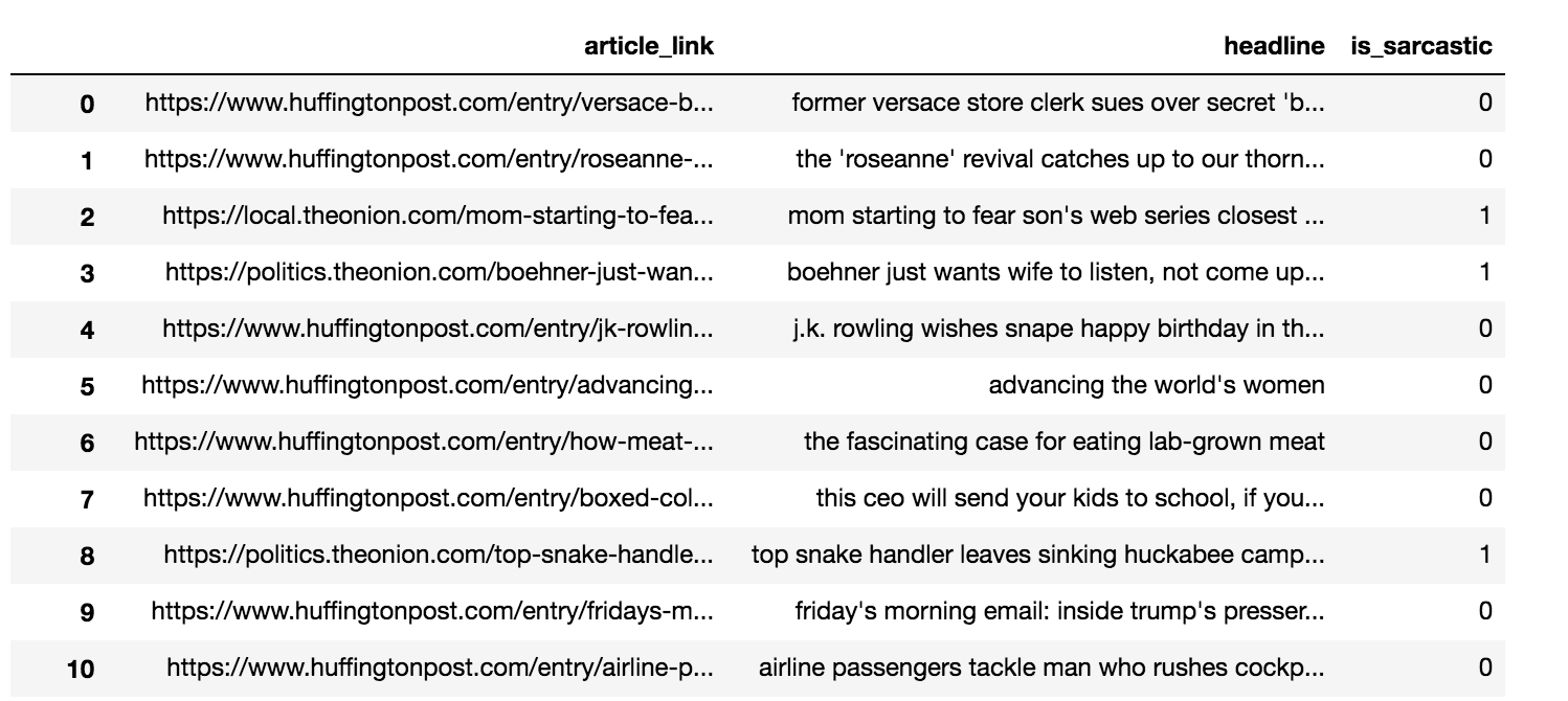 [{"article_link":"https:\/\/www.huffingtonpost.com\/entry\/versace-black-code_us_5861fbefe4b0de3a08f600d5","headline":"former versace store clerk sues over secret 'black code' for minority shoppers","is_sarcastic":0},{"article_link":"https:\/\/www.huffingtonpost.com\/entry\/roseanne-revival-review_us_5ab3a497e4b054d118e04365","headline":"the 'roseanne' revival catches up to our thorny political mood, for better and worse","is_sarcastic":0},{"article_link":"https:\/\/local.theonion.com\/mom-starting-to-fear-son-s-web-series-closest-thing-she-1819576697","headline":"mom starting to fear son's web series closest thing she will have to grandchild","is_sarcastic":1},{"article_link":"https:\/\/politics.theonion.com\/boehner-just-wants-wife-to-listen-not-come-up-with-alt-1819574302","headline":"boehner just wants wife to listen, not come up with alternative debt-reduction ideas","is_sarcastic":1},{"article_link":"https:\/\/www.huffingtonpost.com\/entry\/jk-rowling-wishes-snape-happy-birthday_us_569117c4e4b0cad15e64fdcb","headline":"j.k. rowling wishes snape happy birthday in the most magical way","is_sarcastic":0},{"article_link":"https:\/\/www.huffingtonpost.com\/entry\/advancing-the-worlds-women_b_6810038.html","headline":"advancing the world's women","is_sarcastic":0},....]
