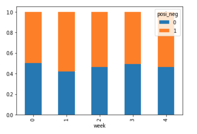 count = pd.crosstab(data['week'], data['posi_neg'])但是我们看到 count 只是每个星期日子的好坏天数,并没有得到比例,该怎么去做?