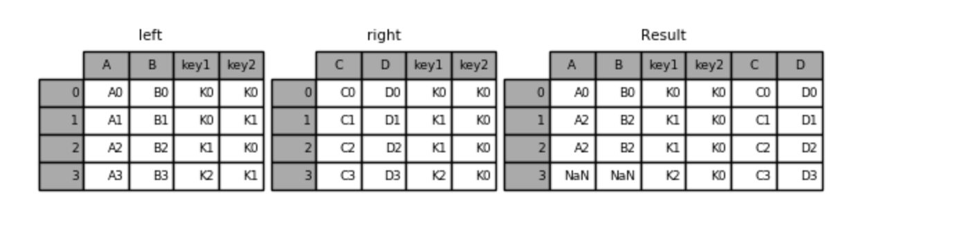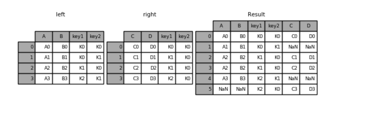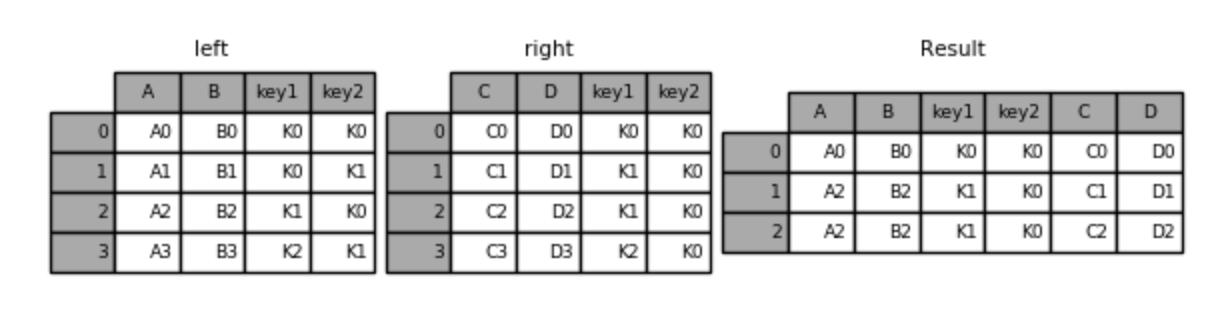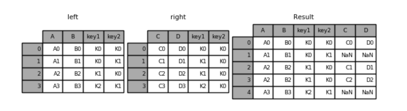 result = pd.merge(left, right, on=['key1', 'key2'])