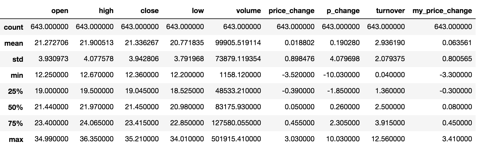 综合分析: 能够直接得出很多统计结果count, mean, std, min, max