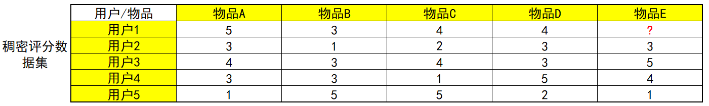 用户-物品的评分矩阵,根据评分矩阵的稀疏程度会有不同的解决方案